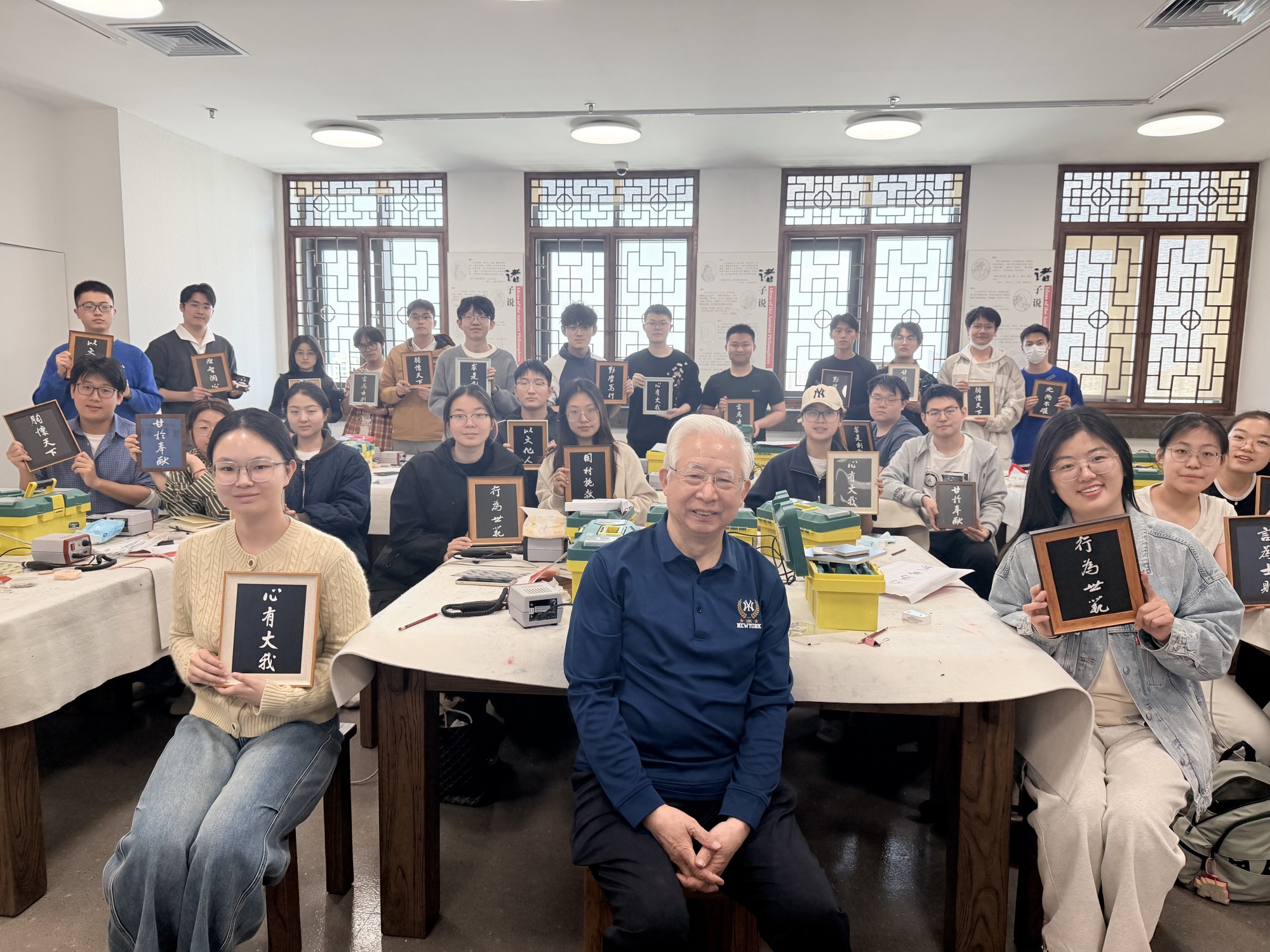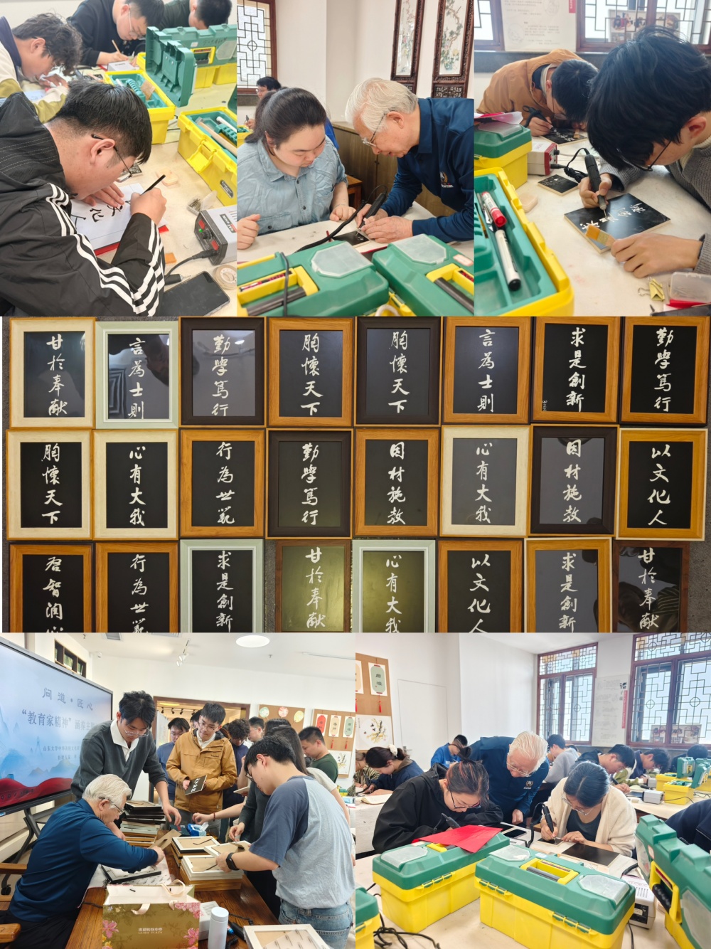 同学们在单老师的指导下,在瓷板上进行字样复写、轮廓勾勒与内里刻制,真实体会从“心到手、从手到刀”的过程,更深刻地理解了“工匠精神”与“教育家精神”的内在共鸣——育人如同雕刻,需要精准、耐心与热爱。课上,师生以刻瓷的形式共创了顾明远先生“教育家精神”书法作品。“胸怀天下”“甘于奉献”“以文化人”“勤学笃行”等字样,同学们在老师的指导下一刀一划,清晰隽永,刀笔之间对如何成为一名好老师有了更生动的理解。大家表示要深植中华优秀传统文化沃土,努力成为兼具学识与品行的“经师”和“人师”,通过跨学科教学设计、实践探究活动,将学科前沿知识与国家发展成果转化为基础教育的鲜活素材,在学生心中播撒下爱国报国、勤学笃行的种子,以实际行动践行教育强国的使命与担当。