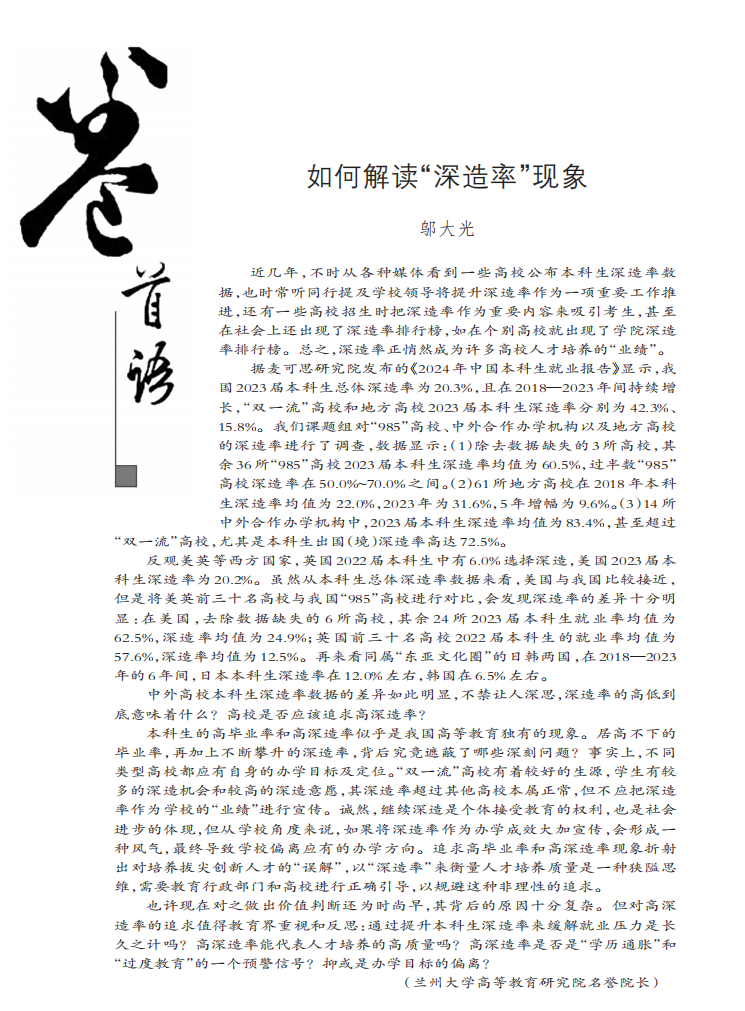 也许现在对之做出价值判断还为时尚早,其背后的原因十分复杂。但对高深造率的追求值得教育界重视和反思:通过提升本科生深造率来缓解就业压力是长久之计吗?高深造率能代表人才培养的高质量吗?高深造率是否是“学历通胀”和“过度教育”的一个预警信号?抑或是办学目标的偏离?